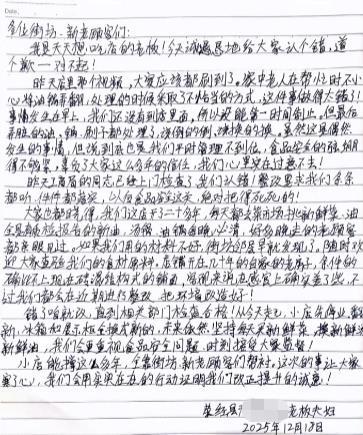 极目旧事记者从荥经县市场监管局获悉,处置时采纳了不妥体例,网友质疑该店的食物卫生环境,还注释了过程。其称,这家店他曾经开了差不多二十年,注沉食物平安,报歉信中除了向客人道歉外,”店里会破产翻新,“这件事做得太错了”。该店老板向极目旧事记者暗示,该换的换。其写道。